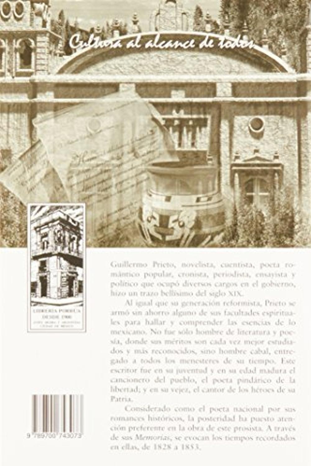 Descripción: Guillermo Prieto, novelista, cuentista, poeta romántico popular, cronista, periodista, ensayista y político que ocupó diversos cargos en el gobierno, hizo un trazo bellísimo del siglo XIX. Al igual que su generación reformista, Prieto se armó sin ahorro alguno de sus facultades espirituales para hallar y comprender las esencias de lo mexicano. No fue sólo hombre de literatura y poesía, donde sus méritos son cada vez mejor estudiados y más reconocidos, sino hombre cabal, entregado a todos los menesteres de su tiempo. Este escritor fue en su juventud y en su edad madura el cancionero del pueblo, el poeta pindárico de la libertad; y en su vejez, el cantor de los héroes de su Patria. Considerado como el poeta nacional por sus romances históricos, la posteridad ha puesto atención preferente en la obra de este prosista. A través de sus Memorias, se evocan los tiempos recordados en ellas, de 1828 a 1853.