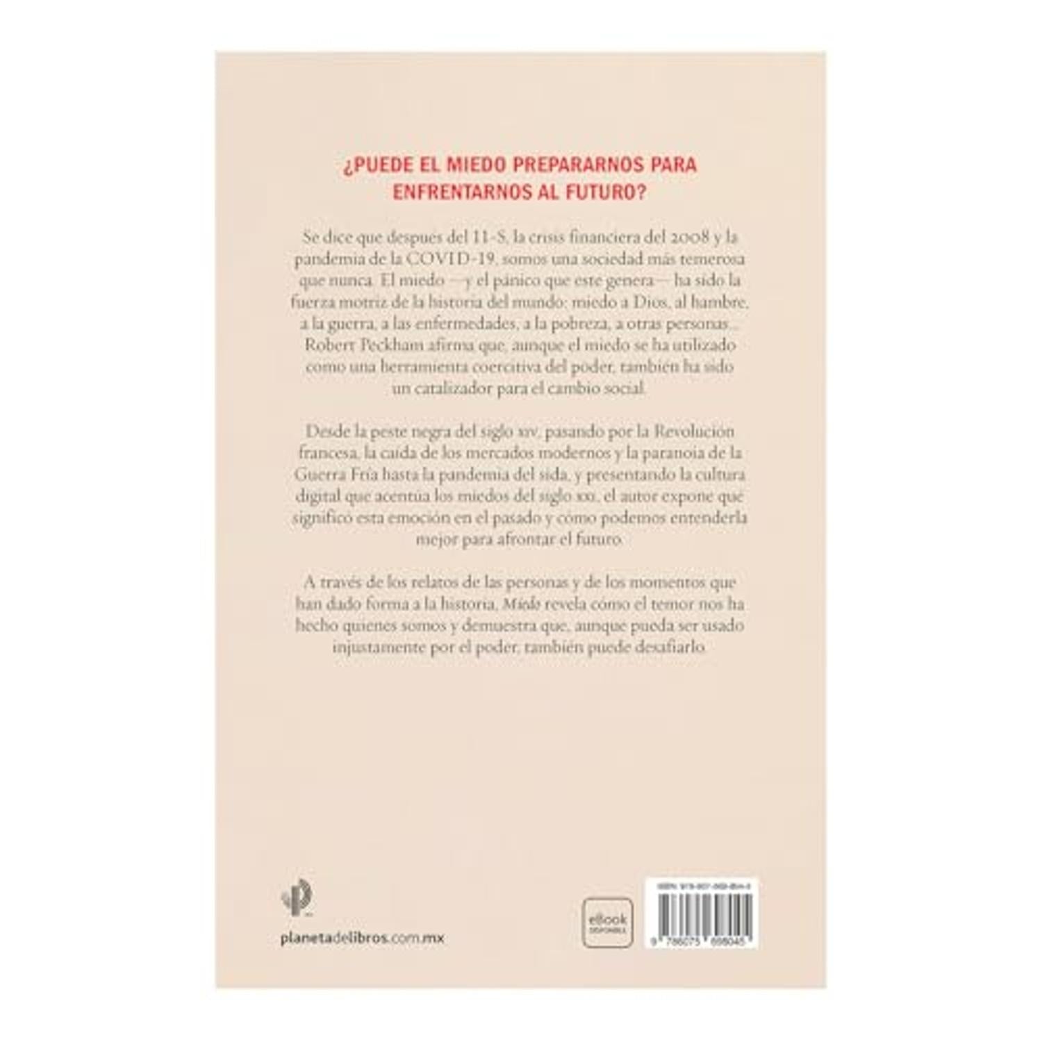 Descripción: ¿Puede el miedo prepararnos para enfrentarnos al futuro? Se dice que después del 11-S, la crisis financiera del 2008 y la pandemia de la COVID-19, somos una sociedad más temerosa que nunca. El miedo —y el pánico que este genera— ha sido la fuerza motriz de la historia del mundo: miedo a Dios, al hambre, a la guerra, a las enfermedades, a la pobreza, a otras personas… Robert Peckham afirma que, aunque el miedo se ha utilizado como una herramienta coercitiva del poder, también ha sido un catalizador para el cambio social. Desde la peste negra del siglo XIV, pasando por la Revolución francesa, la caída de los mercados modernos y la paranoia de la Guerra Fría hasta la pandemia del sida, y presentando la cultura digital, que acentúa los miedos del siglo xxi, el autor expone qué significó esta emoción en el pasado y cómo podemos entenderla mejor para enfrentarnos al futuro. A través de los relatos de las personas y de los momentos que han dado forma a la historia, Miedo revela cómo el temor nos ha hecho quienes somos y demuestra que, aunque pueda ser usado injustamente por el poder, también puede desafiarlo.