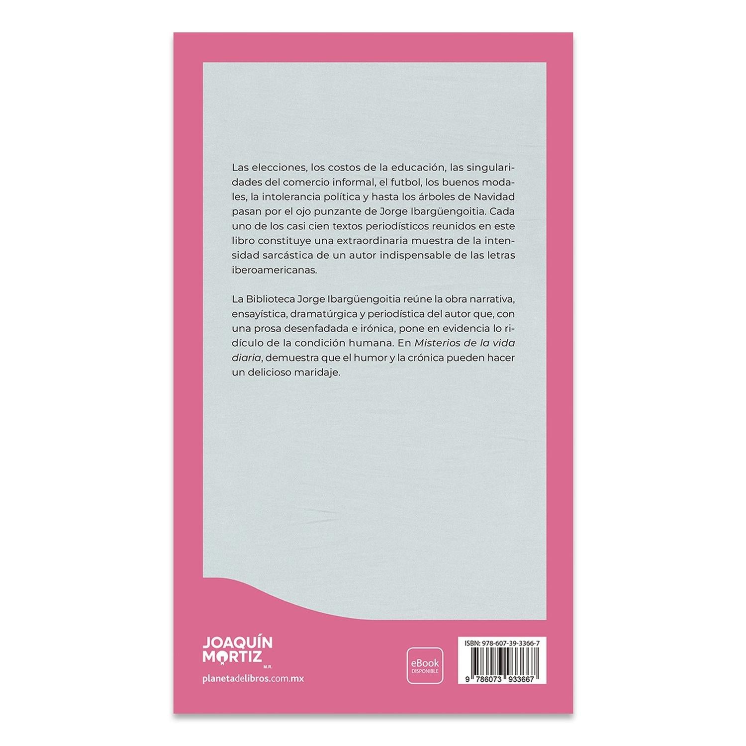 Descripción: Cada uno de los casi cien textos periodísticos que se reúnen en este libro son una extraordinaria muestra de la intensidad sarcástica de un autor indispensable de las letras iberoamericanas. Las elecciones, los costos de la educación, las singularidades del comercio informal, el futbol, los buenos modales, la intolerancia política y hasta los árboles de Navidad pasan por el ojo punzante de Jorge Ibargüengoitia. La Biblioteca Jorge Ibargüengoitia reúne la obra narrativa, ensayística, dramatúrgica y periodística del autor que, con una prosa desenfadada e irónica, pone en evidencia lo ridículo de la condición humana. En Misterios de la vida diaria, el autor demuestra que el humor y la crónica pueden hacer un delicioso maridaje.