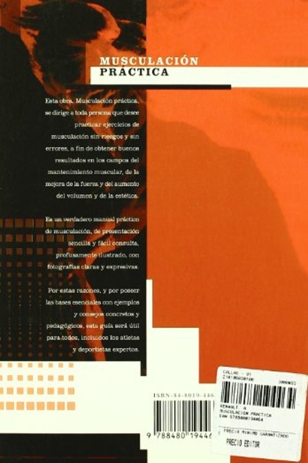 Descripción: La musculación consiste en solicitar los principales grupos musculares con el objetivo de: mantenimiento muscular, prevención y salud, bienestar corporal y estético, mejora de la fuerza y las capacidades físicas. pero hay que evitar errores en su práctica, para lo cual se deben respetar las bases esenciales.breminentemente práctico y totalmente ilustrado con fotografías, este libro ha sido escrito pensando en aquellas personas que deseen practicar ejercicios de musculación sin riesgo y sin errores, a fin de obtener buenos resultados en los campos del mantenimiento muscular, de la mejora de la fuerza y del aumento de volumen y de la estética. por este motivo, el libro complementa las bases esenciales con ejemplos y consejos concretos y pedagógicos, convirtiéndose en una útil guía para todos, incluidos atletas y deportistas expertos.