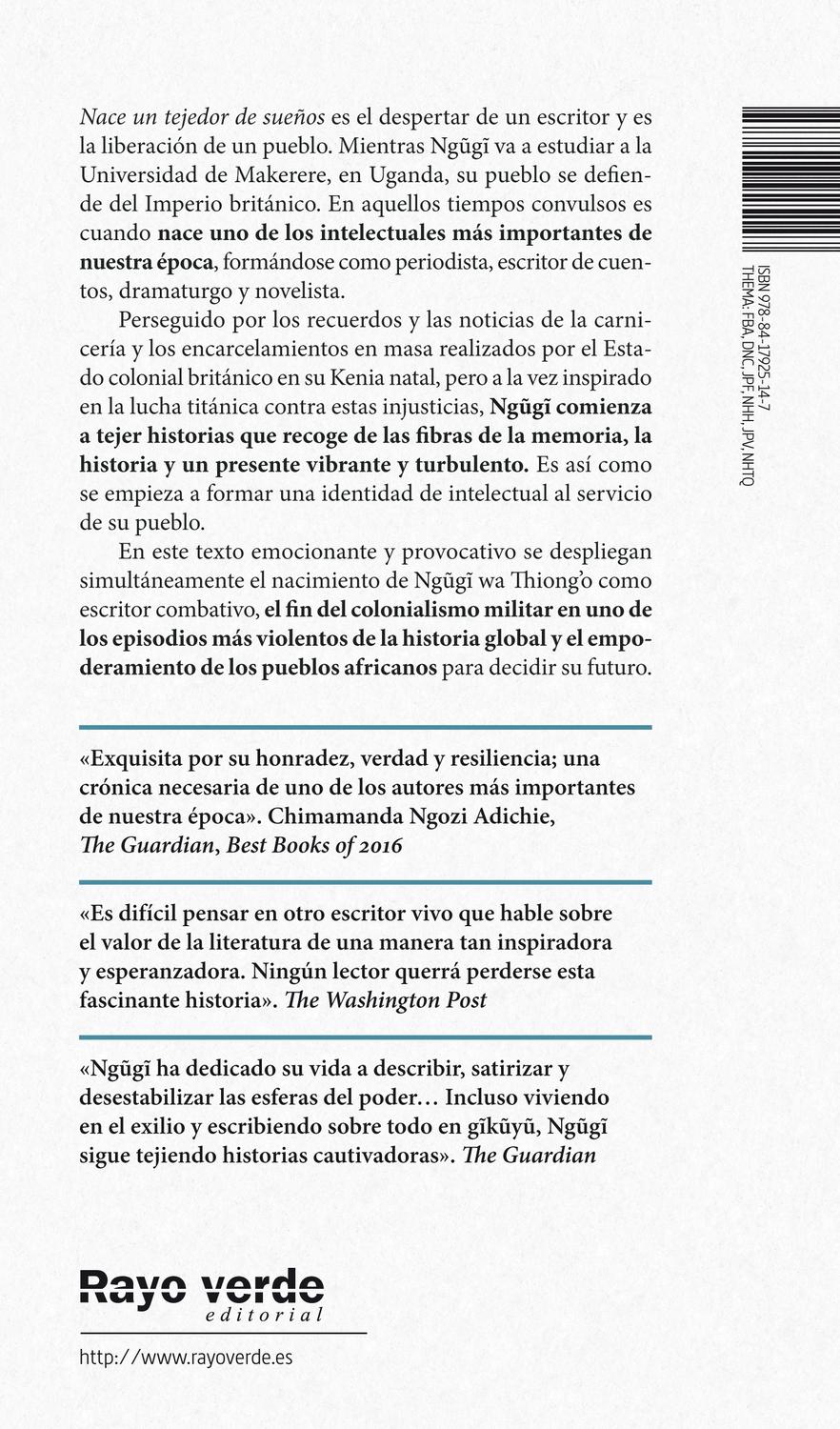 Descripción: Nace un tejedor de sueños es el despertar de un escritor y es la liberación de un pueblo. Mientras Ngugi va a estudiar a la Universidad de Makerere, en Uganda, su pueblo se defiende del Imperio británico. En aquellos tiempos convulsos es cuando nace uno de los intelectuales más importantes de nuestra época, formándose como periodista, escritor de cuentos, dramaturgo y novelista. Perseguido por los recuerdos y las noticias de la carnicería y los encarcelamientos en masa realizados por el Estado colonial británico en su Kenia natal, pero a la vez inspirado en la lucha titánica contra estas injusticias, Ngugi comienza a tejer historias que recoge de las fibras de la memoria, la historia y un presente vibrante y turbulento. Es así como se empieza a formar una identidad de intelectual al servicio de su pueblo.