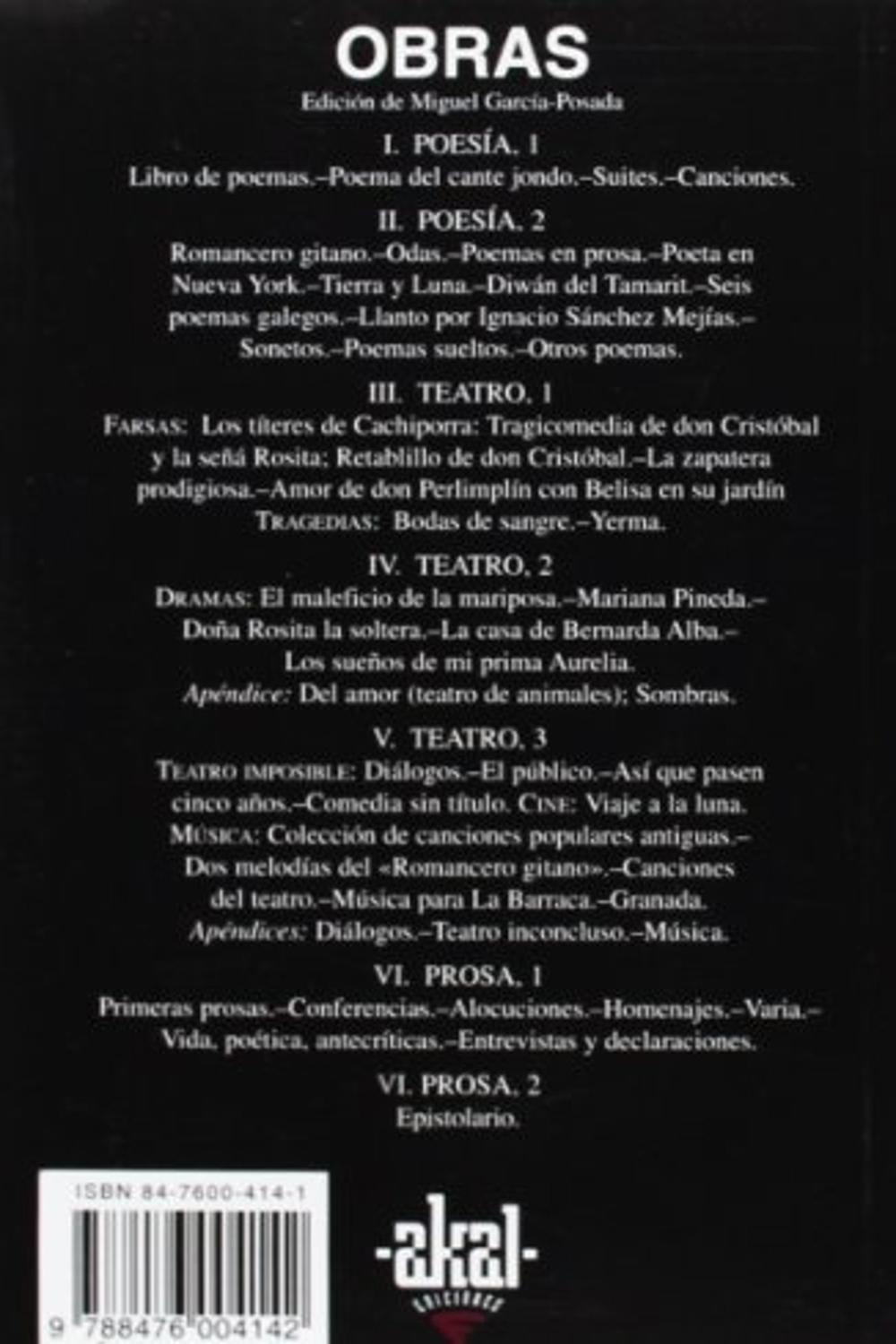 Descripción: Esta edición recopila la poesía de Lorca, incluyendo "Canciones" (1921-1924), "Canto Jondo" (1921-1931) y "Poeta en Nueva York" (1927).