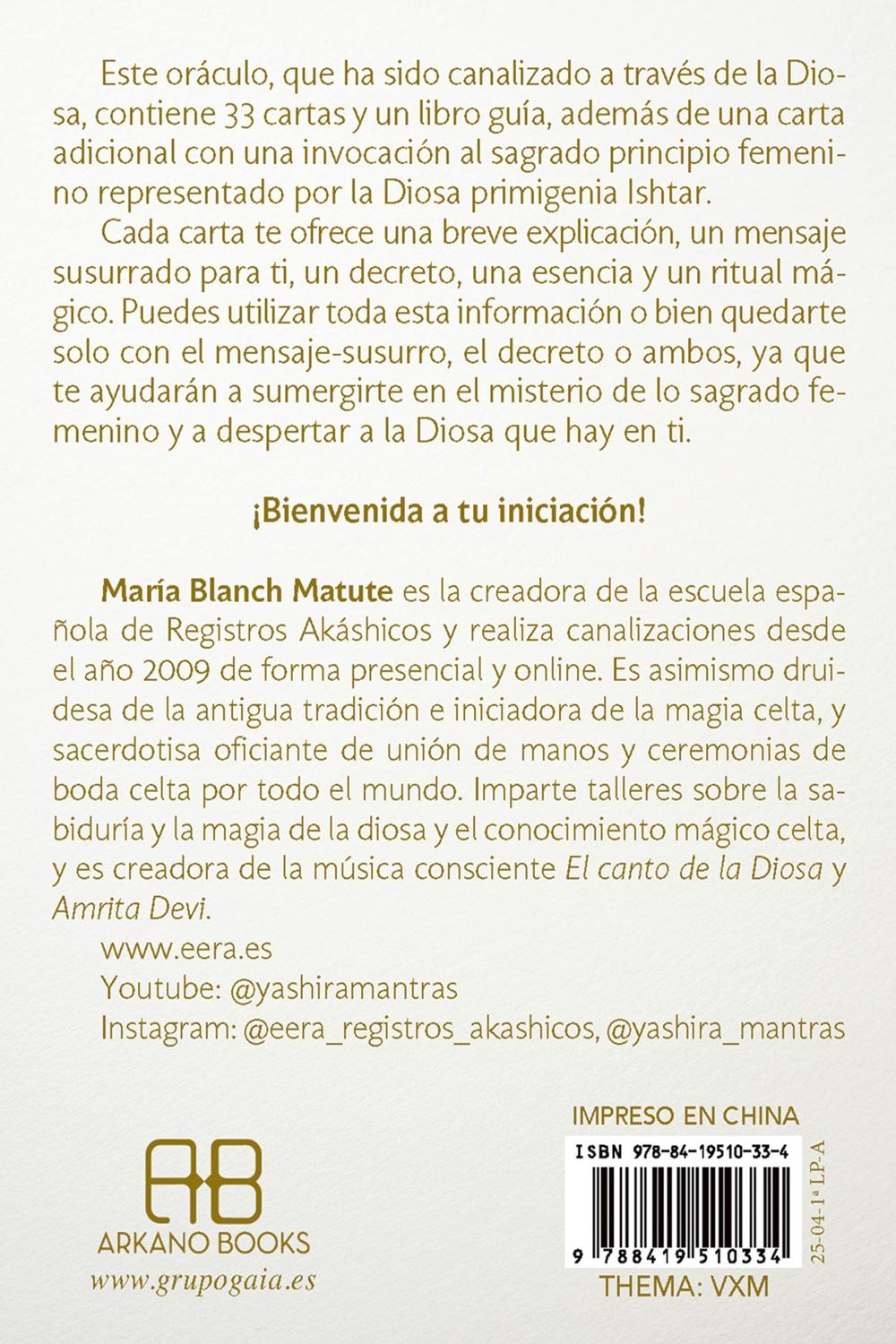 Descripción: Este oráculo, que ha sido canalizado a través de la Diosa, contiene 33 cartas y un libro guía, además de una carta adicional con una invocación al sagrado principio femenino representado por la Diosa primigenia Ishtar. Cada carta te ofrece una breve explicación, un mensaje susurrado para ti, un decreto, una esencia y un ritual mágico. Puedes utilizar toda esta información o bien quedarte solo con el mensaje-susurro, el decreto o ambos, ya que te ayudarán a sumergirte en el misterio de lo sagrado femenino y a despertar a la Diosa que hay en ti. ¡Bienvenida a tu iniciación!