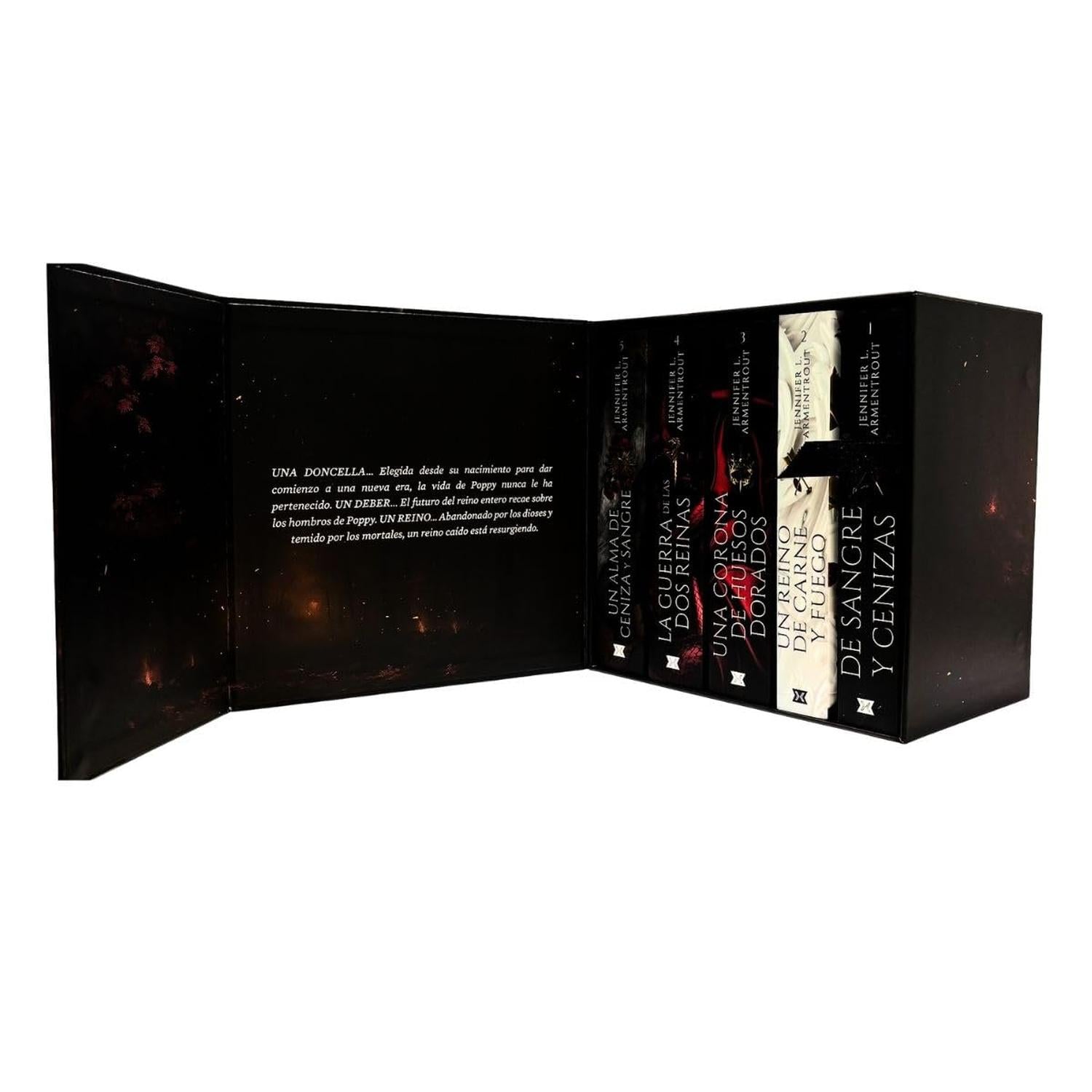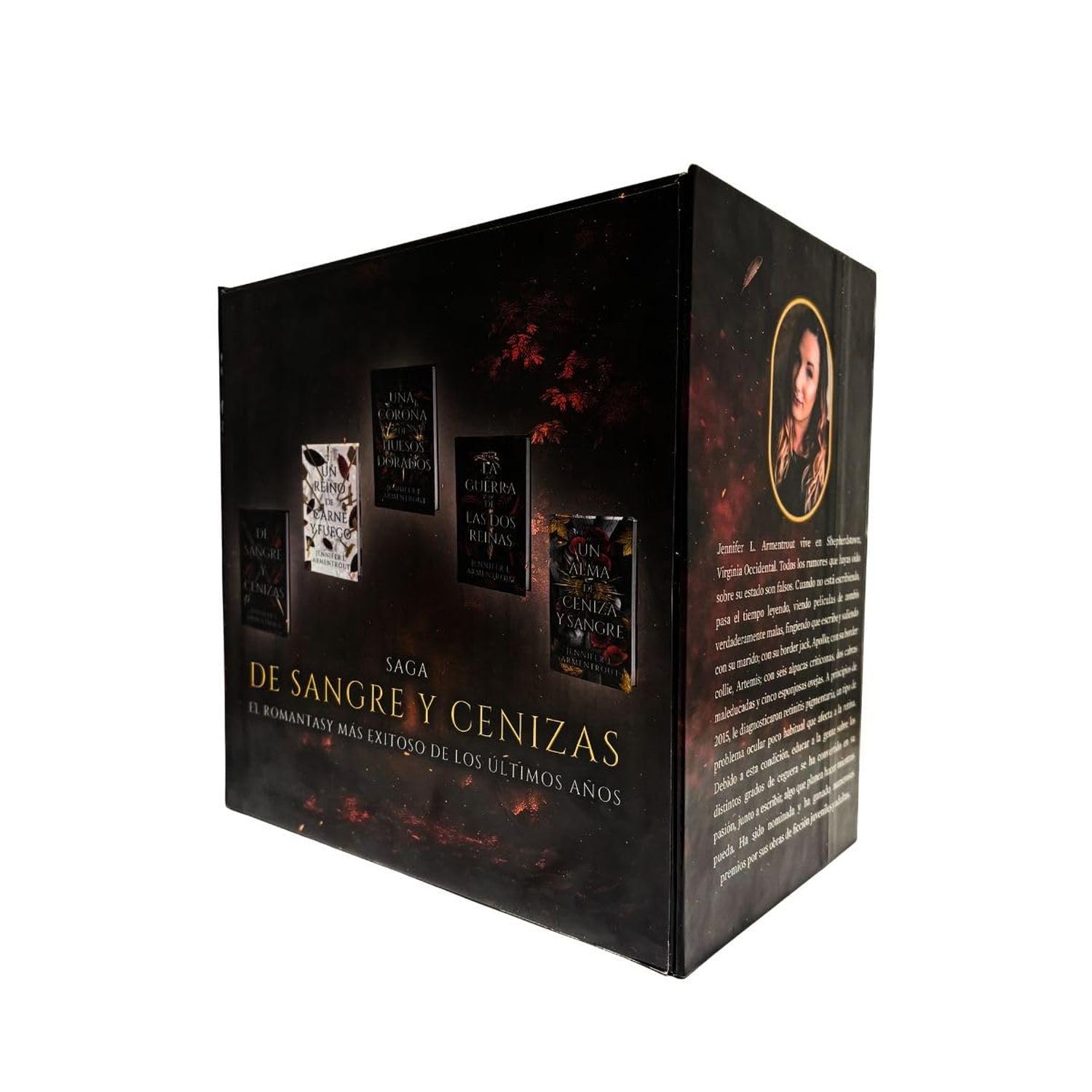 Descripción: Descubre la saga que ha cautivado a millones de lectores. Este box set exclusivo reúne la colección completa de la aclamada serie «De Sangre y Cenizas», una épica historia de fantasía adulta perfecta para los amantes de los romances intensos, las heroínas rebeldes y las tramas llenas de giros inesperados. Sigue la historia de Poppy, la Doncella elegida para un destino que no escogió. Aislada del mundo y destinada a un sacrificio ritual llamado el Ascenso, su vida es una prisión de reglas y silencio. Pero todo cambia cuando Hawke Flynn, un guardia tan atractivo como misterioso, llega para protegerla… y para desafiarla. Juntos descubrirán que los dioses no son lo que parecen, y que la verdad podría destruir su mundo o liberarlo. Incluye los títulos: De Sangre y Cenizas, Un Reino de Carne y Fuego, Una Corona de Huesos Dorados, La Guerra de las Dos Reinas, Un Alma de Ceniza y Sangre. Adéntrate en un universo donde la lealtad, el poder y el amor se entrelazan con un destino que podría cambiar el reino para siempre.