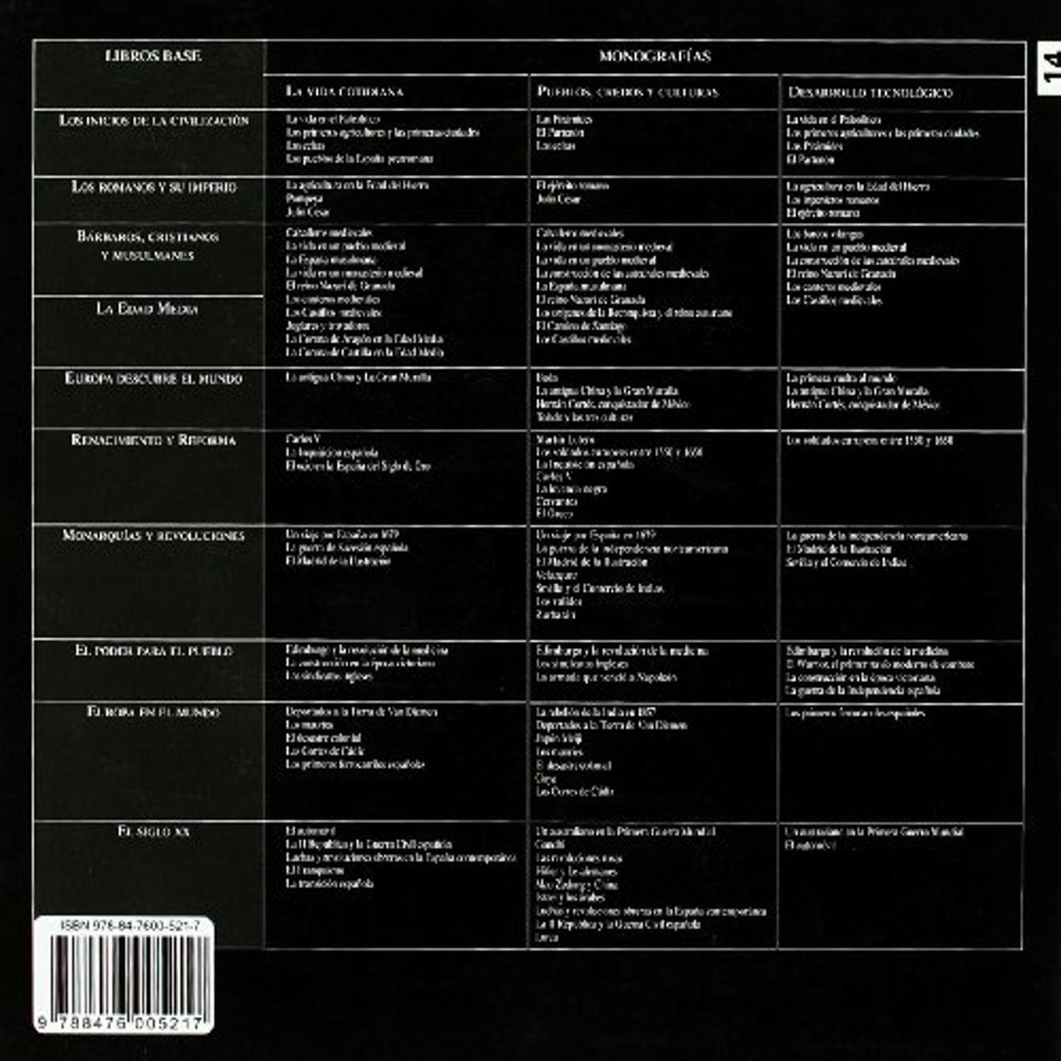 Descripción: La división estructural en libros base y monografías referidas a hechos cruciales para la interpretación de la historia de los pueblos ( conflictos, desarrollo social, cultural y tecnológico, vida cotidiana, pensamiento ) permite tanto la comprensión global de la historia de la humanidad, como la profundización sobre determinados acontecimientos o aspectos generalmente ignorados en los manuales al uso. Los estudiantes encuentran así una forma atractiva y unas amplias posibilidades de su aplicación al estudio de las múltiples facetas del devenir histórico y de las diferencias culturales y sociales. Se combinan así los grandes acontecimientos históricos con aspectos referidos a la vida cotidiana, al pensamiento o a los avances tecnológicos. Se ofrece de este modo una pluralidad de recursos para la investigación individual o colectiva, y para el desarrollo de actividades sobre temas que, a su vez, relacionan la historia del pasado para la comprensión del mundo actual. Todos los libros de esta colección contienen abundantes ilustraciones, esquemas, mapas y gráficos aclaratorios de los textos, y han sido diseñados en un formato especialmente adecuado para la consulta y el trabajo de los alumnos y alumnas