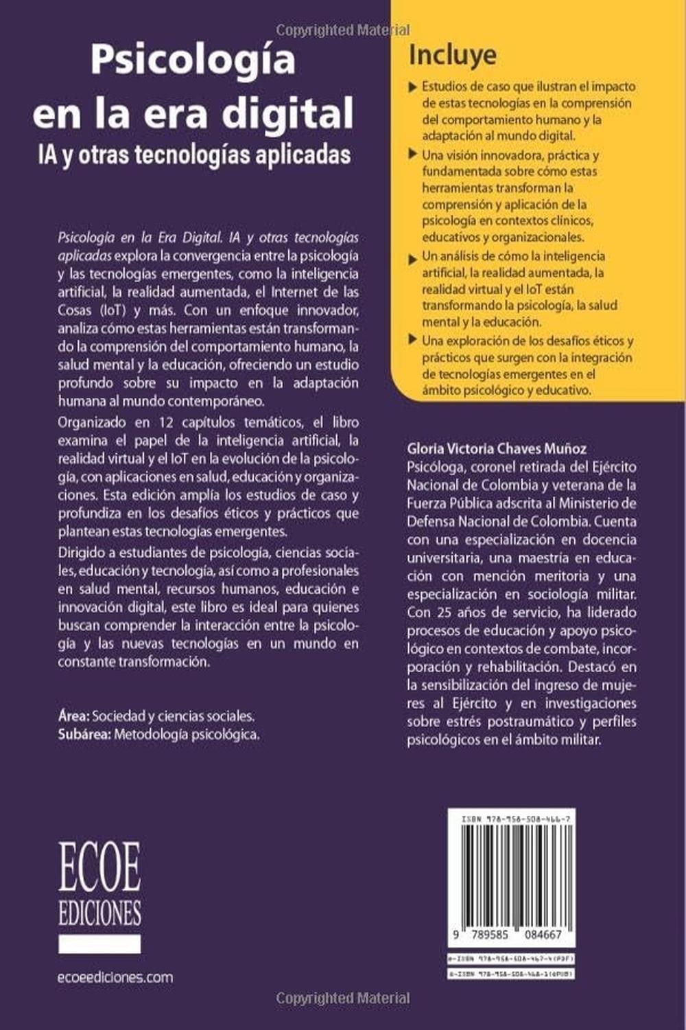 Descripción: Psicología en la era digital. IA y otras tecnologías aplicadas explora la convergencia entre la psicología y las tecnologías emergentes, como la inteligencia artificial, la realidad aumentada, el Internet de las Cosas (IoT) y más. Con un enfoque innovador, analiza cómo estas herramientas están transformando la comprensión del comportamiento humano, la salud mental y la educación, ofreciendo un estudio profundo sobre su impacto en la adaptación humana al mundo contemporáneo.