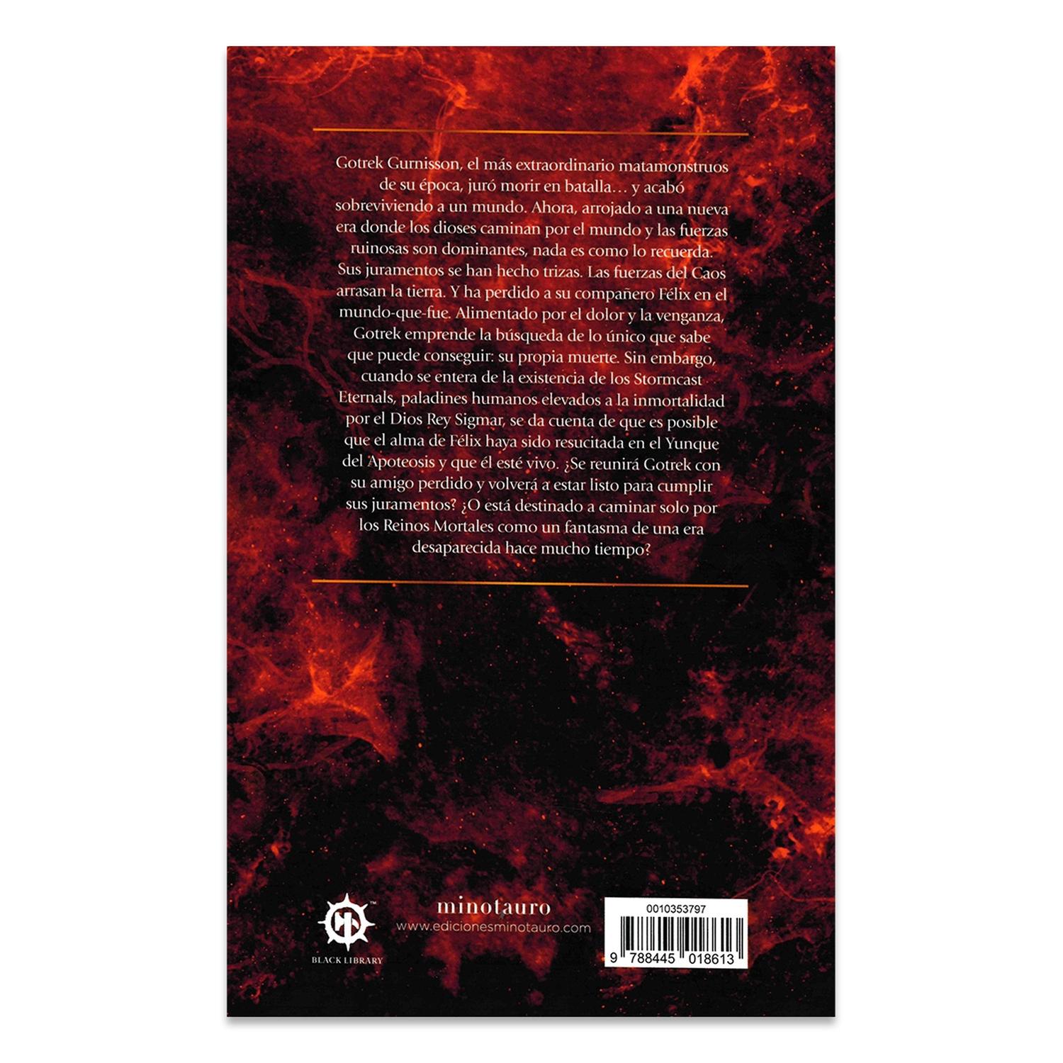 Descripción: Una novela Warhammer Age of Sigmar Gotrek Gurnisson, el más extraordinario matamonstruos de su época, juró morir en batalla… y acabó sobreviviendo a un mundo. Ahora, arrojado a una nueva era donde los dioses caminan por el mundo y las fuerzas ruinosas son dominantes, nada es como lo recuerda. Sus juramentos se han hecho trizas. Las fuerzas del Caos arrasan la tierra. Y ha perdido a su compañero Félix en el mundo-que-fue. Alimentado por el dolor y la venganza, Gotrek emprende la búsqueda de lo único que sabe que puede conseguir: su propia muerte. Sin embargo, cuando se entera de la existencia de los Stormcast Eternals, paladines humanos elevados a la inmortalidad por el Dios Rey Sigmar, se da cuenta de que es posible que el alma de Félix haya sido resucitada en el Yunque del Apoteosis y que él esté vivo. ¿Se reunirá Gotrek con su amigo perdido y volverá a estar listo para cumplir sus juramentos? ¿O está destinado a caminar solo por los Reinos Mortales como un fantasma de una era desaparecida hace mucho tiempo?