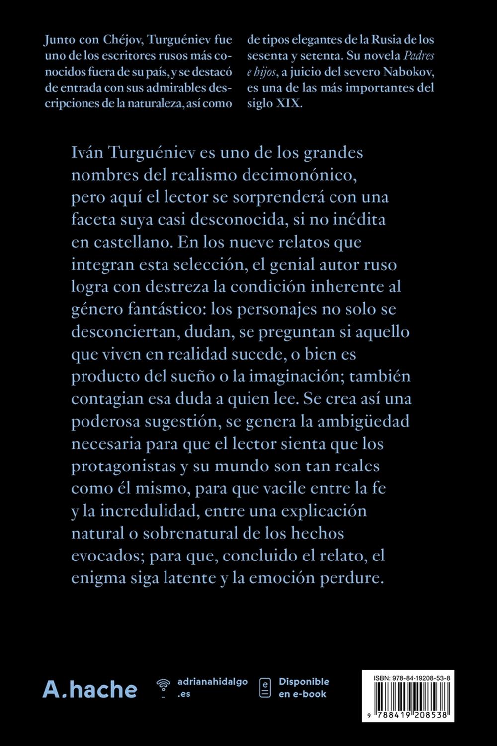 Descripción: En "Relatos fantásticos" el maestro del realismo ruso nos sumerge en mundos donde la frontera entre lo natural y lo sobrenatural se diluye en medio de sugestiones y enigmas que perduran después de su lectura. Iván Turguéniev es uno de los grandes nombres del realismo ruso, pero aquí el lector se sorprenderá con un Turguéniev casi desconocido. Estas historias, prácticamente desconocidas para el lector hispanoparlante, lo revelan también como uno de los grandes escritores de relatos fantásticos. En los nueve relatos que integran esta selección, el genial autor ruso logra con destreza esa condición que Todorov considera inherente al género fantástico: los personajes no sólo se desconciertan, dudan, se preguntan si aquello que viven en realidad sucede, o bien es producto del sueño o la imaginación; también contagian esa duda a quien lee.