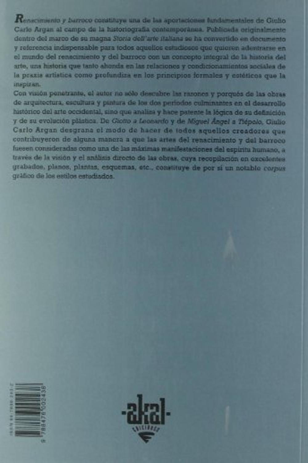 Descripción: Renacimiento y barroco constituye una de la aportaciones fundamentales de Giulio Carlo Argan al campo de la historiografía contemporánea. Publicada originalmente dentro del marco de su magna Storia del- arte italiana se ha convertido en documento y referencia indispensable para todos aquellos estudiosos que quieren adentrarse en el mundo del renacimiento y del barroco con un concepto integral de la historia del arte, una historia que tanto ahonda en las relaciones y condicionamientos sociales de la praxis artística como profundiza en los principios formales y estéticos que la inspiran. Con visión penetrante, el autor no sólo descubre las razones y porqués de las obras de arquitectura, escultura y pintura de los dos períodos culminantes en el desarrollo histórico del arte occidental, sino que analiza y hace patente la lógica de su definición y de su evolución plástica. De Giotto a Leonardo y de Miguel Ángel a Tiépolo, Giulio Carlo Argan desgrana el modo de hacer de todos aquellos creadores que contribuyeron de alguna manera a que las artes del renacimiento y del barroco fuesen consideradas como una de las máximas manifestaciones del espíritu humano, a través de la visión y el análisis directo de las obras, cuya recopilación en excelentes grabados, planos, plantas, esquemas, etc., constituye de por sí un notable corpus gráfico de los estilos estudiados.