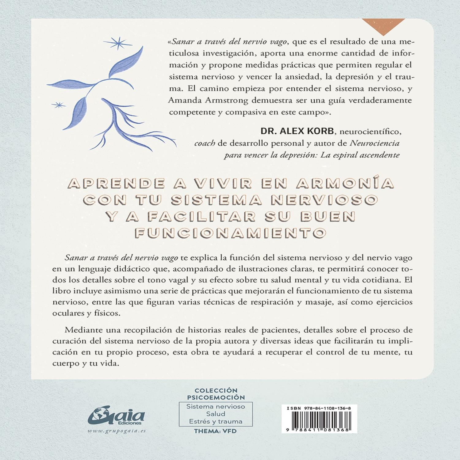 Descripción: Aprende a vivir en armonía con tu sistema nervioso y a facilitar su buen funcionamiento. Sanar a través del nervio vago te explica la función del sistema nervioso y del nervio vago en un lenguaje didáctico que, acompañado de ilustraciones claras, te permitirá conocer todos los detalles sobre el tono vagal y su efecto sobre tu salud mental y tu vida cotidiana. El libro incluye asimismo una serie de prácticas que mejorarán el funcionamiento de tu sistema nervioso, entre las que figuran varias técnicas de respiración y masaje, así como ejercicios oculares y físicos. Mediante una recopilación de historias reales de pacientes, detalles esenciales sobre el proceso de curación del sistema nervioso de la propia autora y diversas ideas que facilitarán tu implicación en tu propio proceso, esta obra te ayudará a recuperar el control de tu mente, tu cuerpo y tu vida.