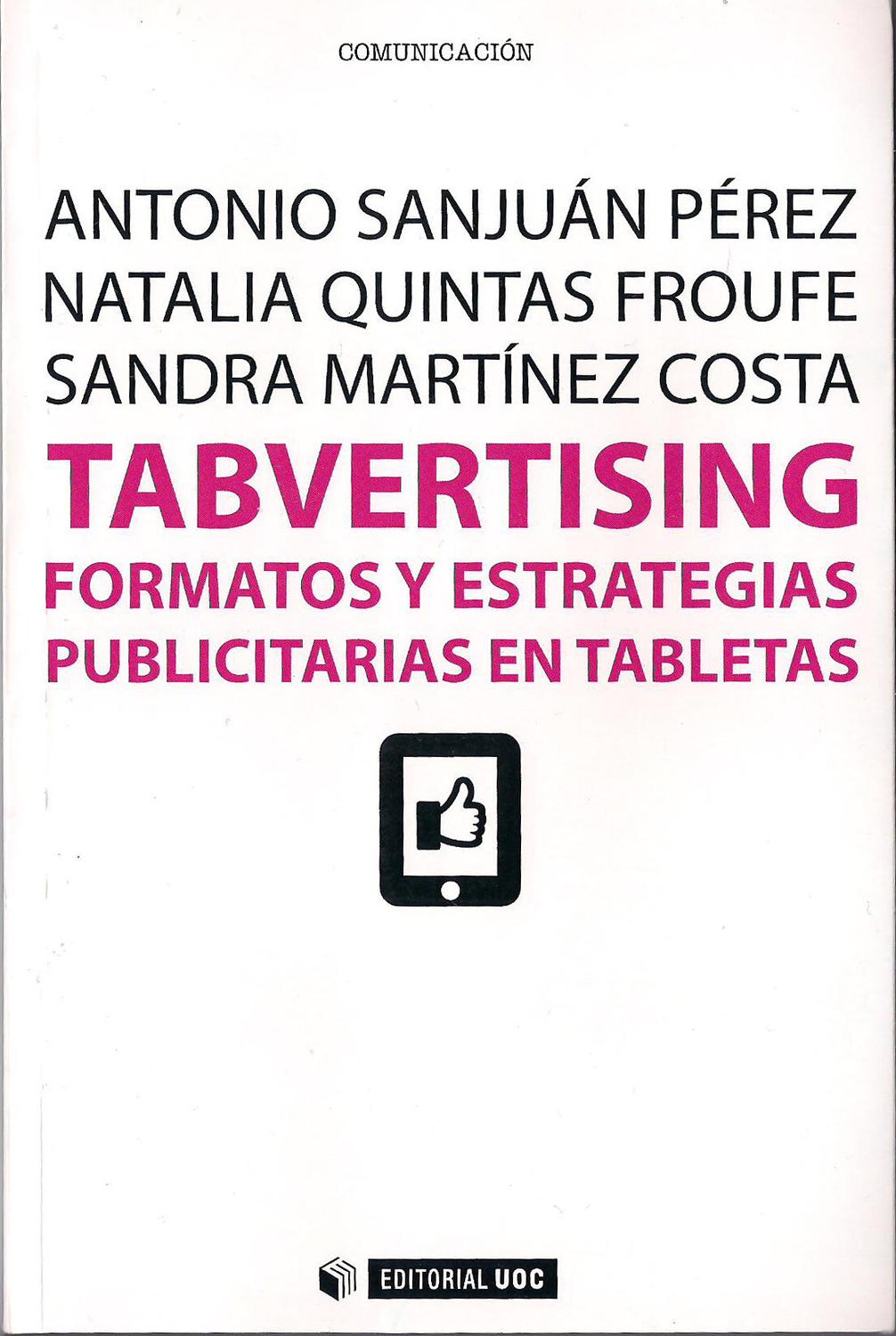 Descripcion: Las tabletas digitales han revolucionado el mercado de los dispositivos móviles y han cambiado la forma en la que el usuario interactúa con la publicidad. Se han definido nuevas estrategias, nuevas tipologías de apps, nuevos formatos interactivos y no interactivos; y se han encontrado grandes posibilidades para los anunciantes. Este libro pretende mostrar algunas de las estrategias publicitarias más comunes entre el anunciante, así casos de éxito en el mundo de las tabletas digitales que los ejemplifiquen. El storytelling, el advergaming, el advertainment, la publicidad para revistas,la prensa diaria o las aplicaciones de anunciantes más descargadas configuran el Tabvertising, la denominada por el Interactive Advertising Bureau como publicidad creada para tabletas digitales.