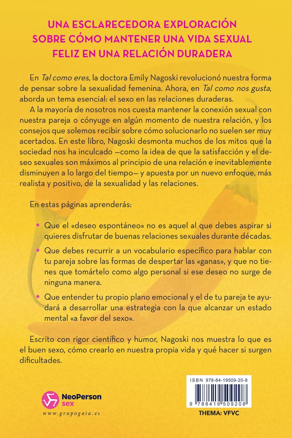 Descripción: Autora de Tal como eres, bestseller del New York Times. Una esclarecedora exploración sobre cómo mantener una vida sexual feliz en una relación duradera En Tal como eres, la doctora Emily Nagoski revolucionó nuestra forma de pensar sobre la sexualidad femenina. Ahora, en Tal como nos gusta, aborda un tema esencial: el sexo en las relaciones duraderas. A la mayoría de nosotros nos cuesta mantener la conexión sexual con nuestra pareja o cónyuge en algún momento de nuestra relación, y los consejos que solemos recibir sobre cómo solucionarlo no suelen ser muy acertados. En este libro, Nagoski desmonta muchos de los mitos que la sociedad nos ha inculcado como la idea de que la satisfacción y el deseo sexuales son máximos al principio de una relación e inevitablemente disminuyen a lo largo del tiempo, y apuesta por un nuevo enfoque, más realista y positivo, de la sexualidad y las relaciones.