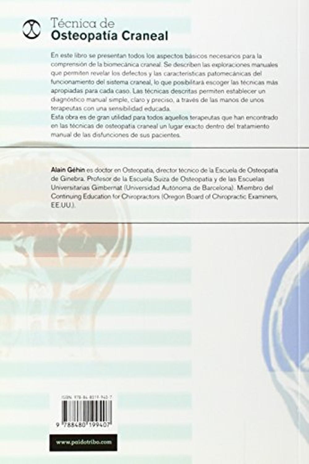 Descripción: En este libro se presentan todos los aspectos básicos necesarios para la comprensión de la biomecánica craneal. se describen las exploraciones manuales que permiten revelar los defectos y las características patomecánicas del funcionamiento del sistema craneal, lo que posibilitará escoger las técnicas más apropiadas para cada caso. las técnicas descritas permiten establecer un diagnóstico manual simple, claro y preciso, a través de las manos de unos terapeutas con una sensibilidad educada.bresta obra es de gran utilidad para todos aquellos terapeutas que han encontrado en las técnicas de osteopatía craneal un lugar exacto dentro del tratamiento manual de las disfunciones de sus pacientes.bralain géhin es doctor en osteopatía, director técnico de la escuela de osteopatía de ginebra. profesor de la escuela suiza de osteopatía y de las escuelas universitarias gimbernat (universidad autónoma de barcelona). miembro del continuing education for chiropractors (oregon board of chiropractic examiners, ee.uu.).