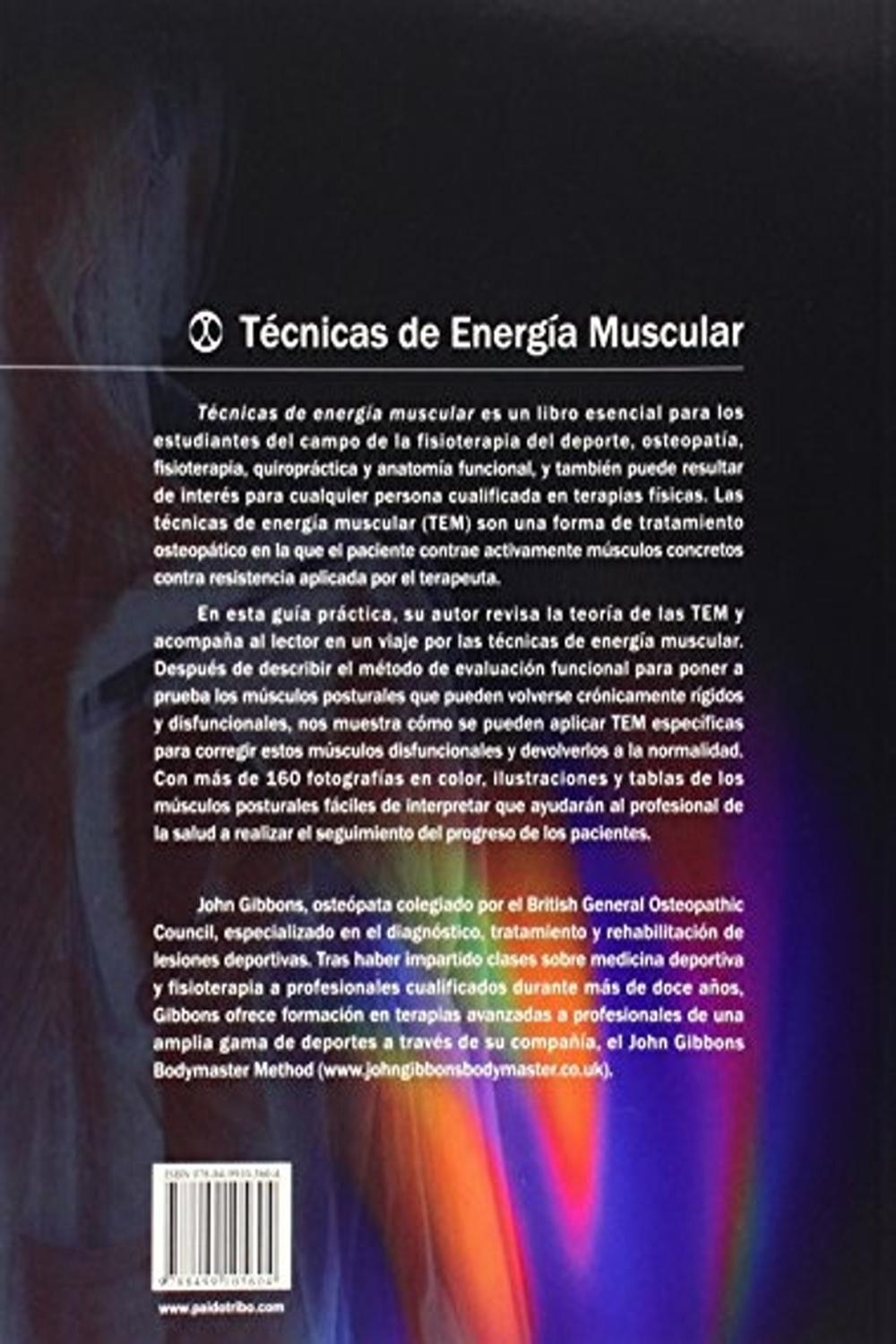 Descripción: Técnicas de energía muscular es un libro esencial para los estudiantes del campo de la fisioterapia del deporte, osteopatía, fisioterapia, quiropráctica y anatomía funcional, y también puede resultar de interés para cualquier persona cualificada en terapias físicas. las técnicas de energía muscular (tem) son una forma de tratamiento osteopático en la que el paciente contrae activamente músculos concretos contra resistencia aplicada por el terapeuta.bren esta guía práctica, su autor revisa la teoría de las tem y acompaña al lector en un viaje por las técnicas de energía muscular. después de describir el método de evaluación funcional para poner a prueba los músculos posturales que pueden volverse crónicamente rígidos y disfuncionales, nos muestra cómo se pueden aplicar tem específicas para corregir estos músculos disfuncionales y devolverlos a la normalidad. con más de 160 fotografías en color, ilustraciones y tablas de los músculos posturales fáciles de interpretar que ayudarán al profesional de la salud a realizar el seguimiento del progreso de los pacientes.john gibbons, osteópata colegiado por el british general osteopathic council, especializado en el diagnóstico, tratamiento y rehabilitación de lesiones deportivas. tras haber impartido clases sobre medicina deportiva y fisioterapia a profesionales cualificados durante más de doce años, gibbons ofrece formación en terapias avanzadas a profesionales de una amplia gama de deportes a través de su compañía, el john gibbons bodymaster method (www.johngibbonsbodymaster.co.uk).