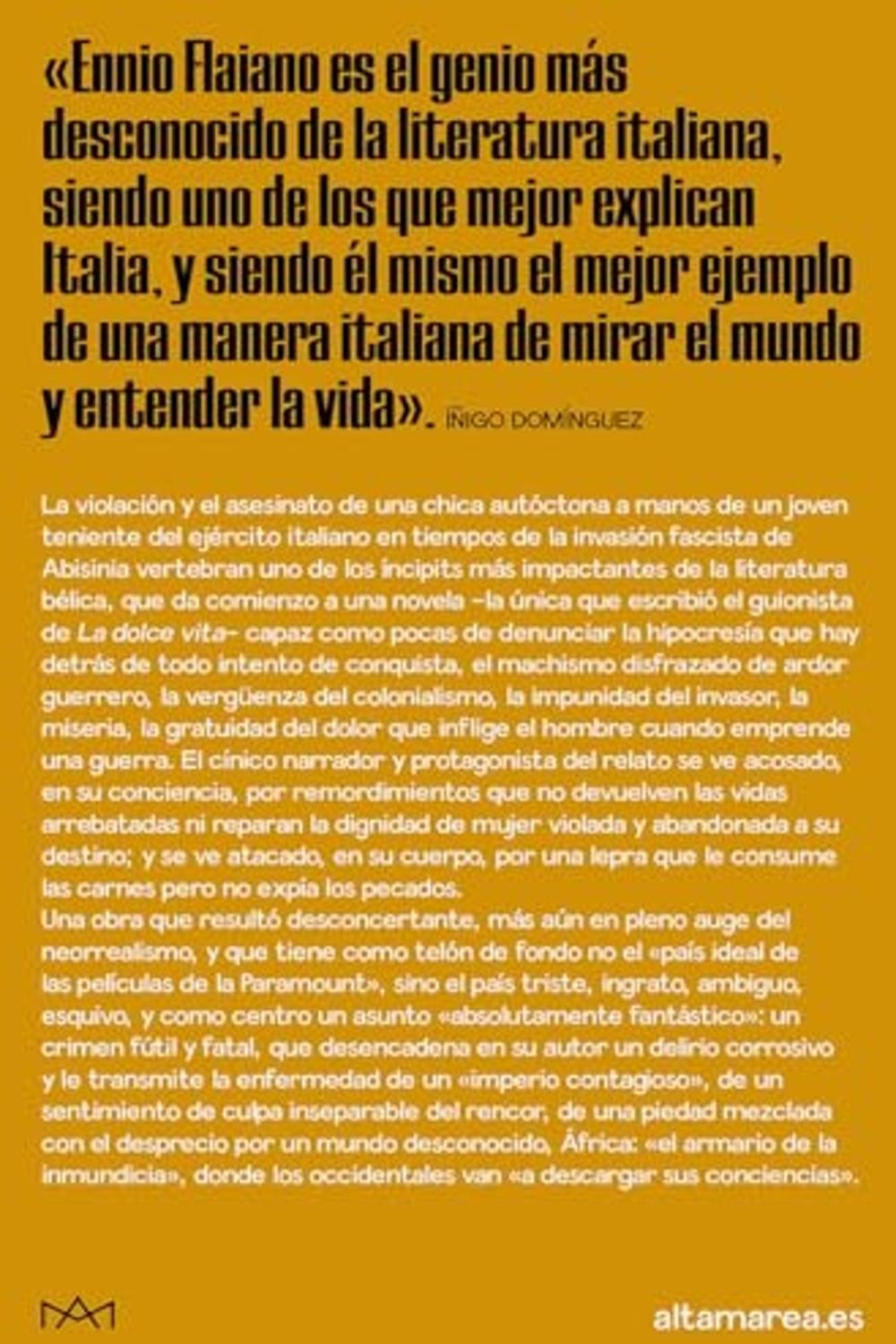 Descripción: La violación y el asesinato de una chica autóctona a manos de un joven teniente del ejército italiano en tiempos de la invasión fascista de Abisinia vertebran uno de los íncipits más impactantes de la literatura bélica, que da comienzo a una novela –la única que escribió el guionista de La dolce vita– capaz como pocas de denunciar la hipocresía que hay detrás de todo intento de conquista, el machismo disfrazado de ardor guerrero, la vergüenza del colonialismo, la impunidad del invasor, la miseria, la gratuidad del dolor que inflige el hombre cuando emprende una guerra. El cínico narrador y protagonista del relato se ve acosado, en su conciencia, por remordimientos que no devuelven las vidas arrebatadas ni reparan la dignidad de mujer violada y abandonada a su destino; y se ve atacado, en su cuerpo, por una lepra que le consume las carnes pero no expía los pecados.
