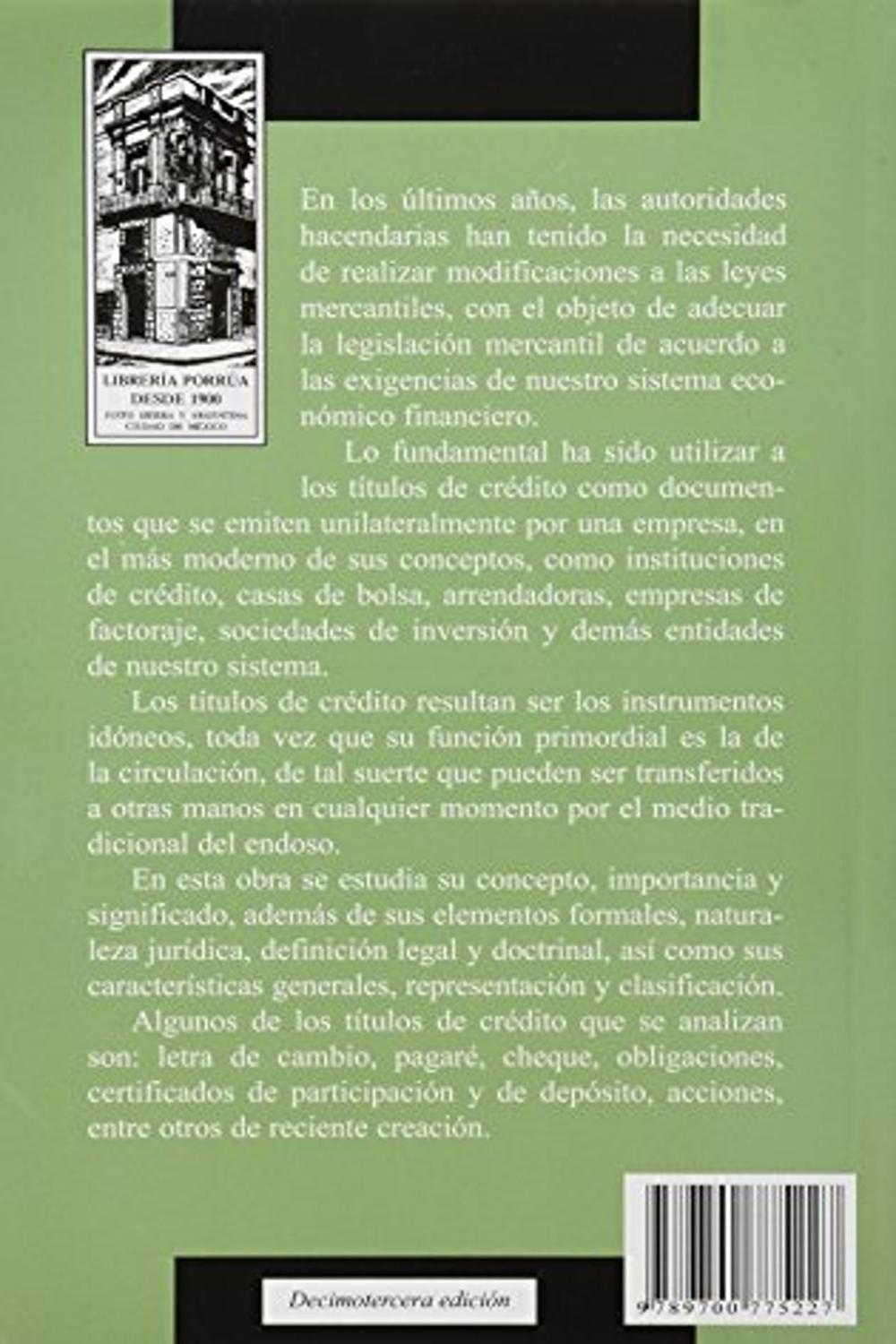 Descripción: En los últimos años, las autoridades hacendarias han realizado modificaciones a las leyes mercantiles para adecuarlas a las exigencias del sistema económico-financiero del país. Los títulos de crédito se han utilizado, de manera fundamental, como documentos emitidos unilateralmente por una empresa, en el más moderno de sus conceptos, como instituciones de crédito, casas de bolsa, arrendadoras, compañías de factoraje, sociedades de inversión y demás entidades financieras. Y han demostrado que son instrumentos idóneos debido a que su función primordial es la circulación, por lo cual pueden transferirse a otras manos en cualquier momento por el medio tradicional del endoso. En esta obra se estudian su concepto, importancia y significado, elementos formales, naturaleza jurídica, definición legal y doctrinal, así como sus características generales, representación y clasificación. Algunos de los títulos de crédito que se analizan son letra de cambio, pagaré, cheque, obligaciones, certificados de participación y de depósito, acciones, entre otros de reciente creación.