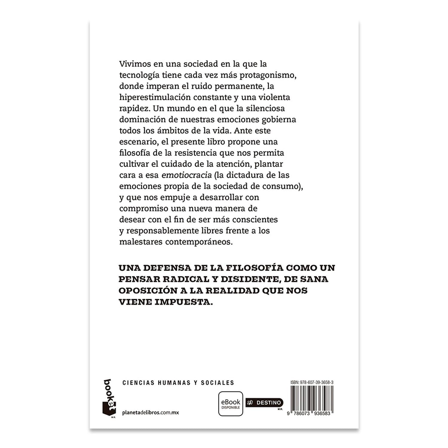 Descripción: UN CONTUNDENTE ENSAYO DE UNO DE LOS FILÓSOFOS CON MÁS PROYECCIÓN DEL MOMENTO. 3.ª edición Una defensa de la filosofía contra la manipulación intelectual y el totalitarismo emocional Vivimos en una sociedad en la que la tecnología tiene cada vez más protagonismo, donde impera el ruido permanente, la hiperestimulación constante y una violenta rapidez. Un mundo en el que la silenciosa dominación de nuestras emociones gobierna todos los ámbitos de la vida. Ante este escenario, el presente libro propone una filosofía de la resistencia que nos permita cultivar el cuidado de la atención, plantar cara a esa emotiocracia (la dictadura de las emociones propia de la sociedad de consumo), y que nos empuje a desarrollar con compromiso una nueva manera de desear con el fin de ser más conscientes y responsablemente libres frente a los malestares contemporáneos. Pensar y actuar: una revolución intelectual que pasa por dejar de observar la realidad como sujetos pasivos para tomarla en nuestras manos como agentes activos y poder pensarla, sí, pero, sobre todo, transformarla. UNA DEFENSA DE LA FILOSOFÍA COMO UN PENSAR RADICAL Y DISIDENTE, DE SANA OPOSICIÓN A LA REALIDAD QUE NOS VIENE IMPUESTA.