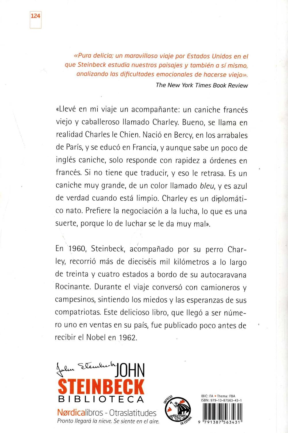 Descripción: "Llevé en mi viaje un acompañante: un caniche francés viejo y caballeroso llamado Charley. Bueno, se llama en realidad Charles le Chien. Nació en Bercy, en los arrabales de París, y se educó en Francia, y aunque sabe un poco de inglés caniche, sólo responde con rapidez a órdenes en francés. Si no tiene que traducir, y eso le retrasa. Es un caniche muy grande, de un color llamado bleu, y es azul de verdad cuando está limpio. Charley es un diplomático nato. Prefiere la negociación a la lucha, lo que es una suerte, porque lo de luchar se le da muy mal". En 1960, Steinbeck, acompañado por su perro Charley, recorrió más de 16.000 kilómetros a lo largo de treinta y cuatro estados a bordo de su autocaravana Rocinante. Durante el viaje conversó con camioneros y campesinos, sintiendo los miedos y las esperanzas de sus compatriotas. Este delicioso libro, que llegó a ser número uno en ventas en su país, fue publicado poco antes de recibir el Nobel en 1962.