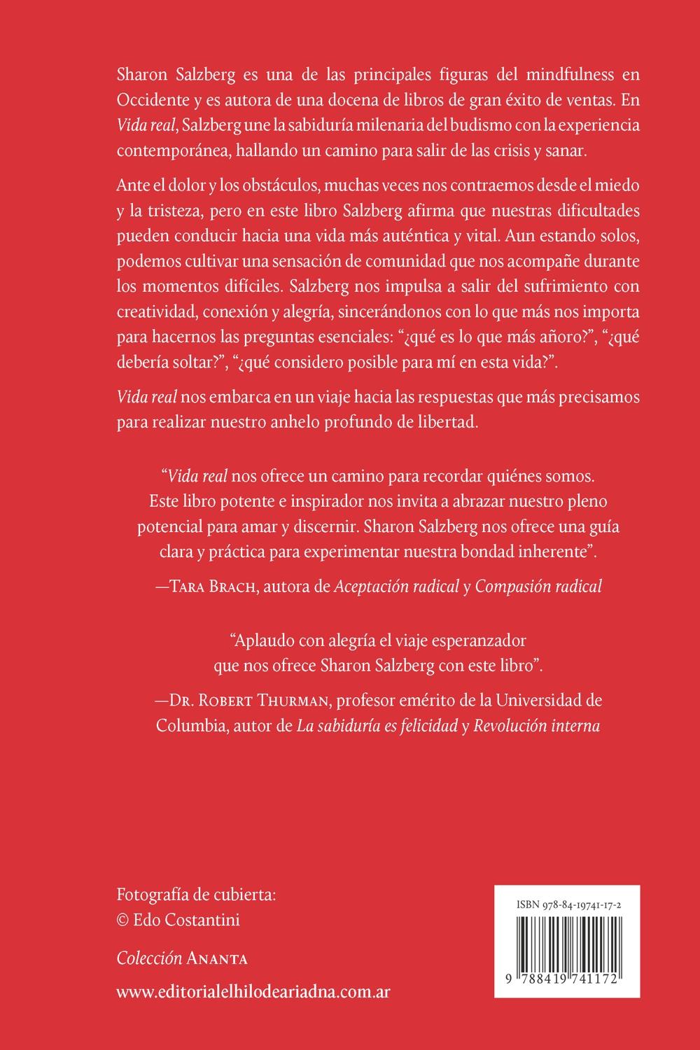 Descripción: Sharon Salzberg es una de las principales figuras del mindfulness en Occidente y es autora de una docena de libros de gran éxito de ventas. En Vida real, Salzberg une la sabiduría milenaria del budismo con la experiencia contemporánea, hallando un camino para salir de la crisis y sanar. Ante el dolor y los obstáculos, muchas veces nos contraemos desde el miedo y la tristeza, pero en este libro Salzberg afirma que nuestras dificultades pueden conducir hacia una vida más auténtica y vital. Aun estando solos, podemos cultivar una sensación de comunidad que nos acompañe durante los momentos difíciles. Salzberg nos impulsa a salir del sufrimiento con creatividad, conexión y alegría, sincerándonos con lo que más nos importa para hacernos las preguntas esenciales: «¿qué es lo que más añoro?», «¿qué debería soltar?», «¿qué considero posible para mí en esta vida?». Vida real nos embarca en un viaje hacia las respuestas que más precisamos para realizar nuestro anhelo profundo de libertad.