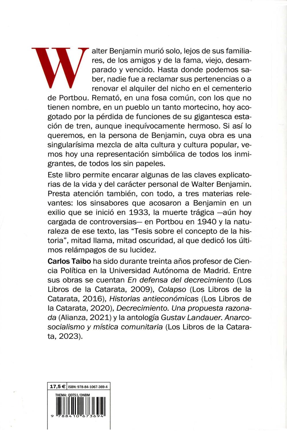 Descripción: Benjamin es un intérprete precursor de muchos de los fenómenos que nos acosan. Su obra lo abarca todo y el tiempo no pasa por ella. Walter Benjamin murió solo, lejos de sus familiares, de los amigos y de la fama, viejo, desamparado y vencido. Hasta donde podemos saber, nadie fue a reclamar sus pertenencias o a renovar el alquiler del nicho en el cementerio de Portbou. Remató, en una fosa común, con los que no tienen nombre, en un pueblo un tanto mortecino, hoy acogotado por la pérdida de funciones de su gigantesca estación de tren, aunque inequívocamente hermoso. Si así lo queremos, en la persona de Benjamin, cuya obra es una singularísima mezcla de alta cultura y cultura popular, vemos hoy una representación simbólica de todos los inmigrantes, de todos los sin papeles. Este libro permite encarar algunas de las claves explicatorias de la vida y del carácter personal de Walter Benjamin.